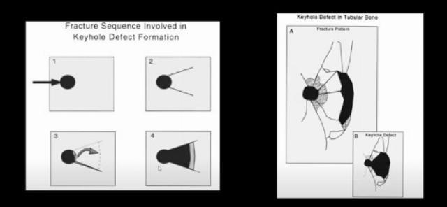 A keyhole fracture has a characteristic pattern of both gunshot entrance and exit trauma. Keyhole fractures can be created by bullets penetrating the skull at an angle, by a bullet yawing off path, or by grazing the skull at a tangential trajectory without penetrating into the intracranium. These fractures exhibit a circular entrance defect and a triangular exit deficit created by bone or bullet fragments propagating from the initial point of impact on external examination or CT imaging.