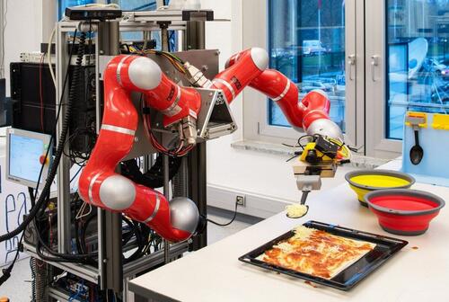 A robot sprinkles cheese over a pizza at the Institute for Artificial Intelligence of the University of Bremen, Germany, on March 8, 2017. Ingo Wagner/dpa/AFP via Getty Images
