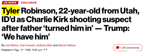 AP News and the New York Post both report that the suspect in the Charlie Kirk assassination is 22-year-old Tyler Robinson of Utah. Robinson's father apparently turned him in to the authorities - that is the official narrative so far.