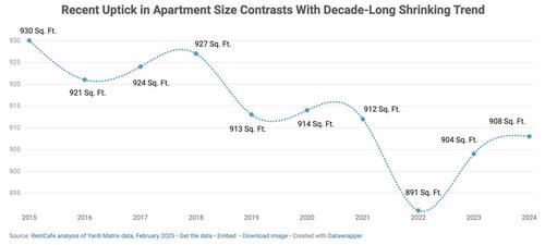 As the 2025 rental season kicks off, square footage is becoming the new currency for renters. After a decade of shrinking apartments, new data from RentCafe shows that average unit sizes grew again in 2024, reaching 908 square feet — a reversal driven largely by market demand for more livable space, according to RentCafe.
