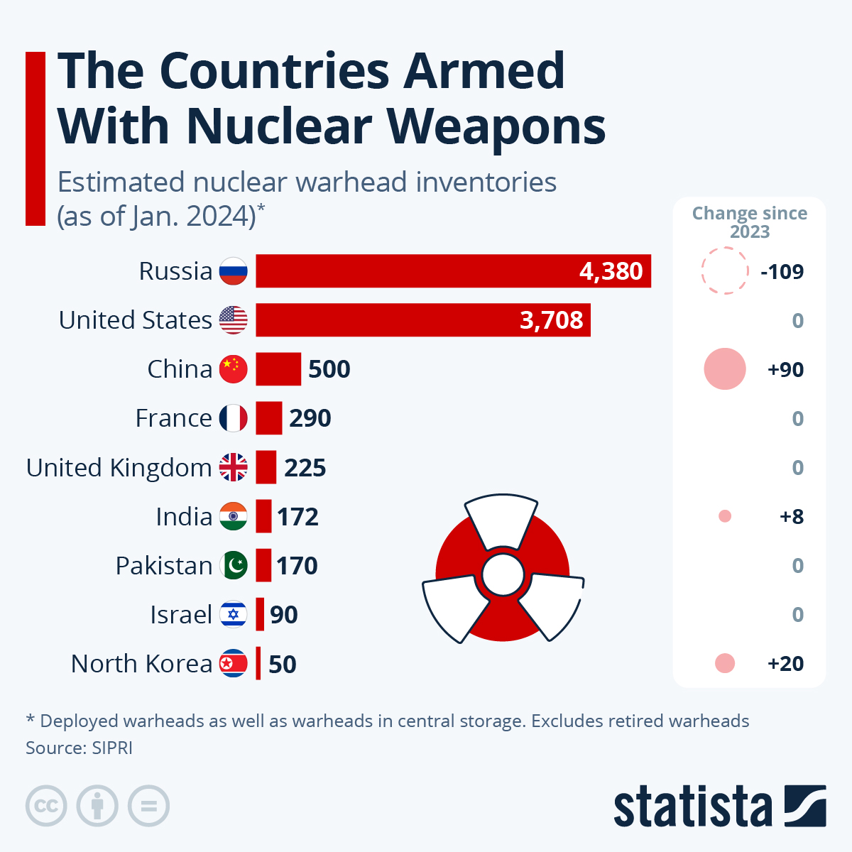 According to data from the Stockholm International Peace Research Institute (SIPRI), each nation owns around 170 nuclear warheads.