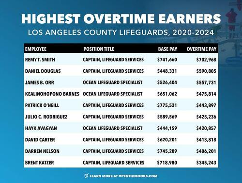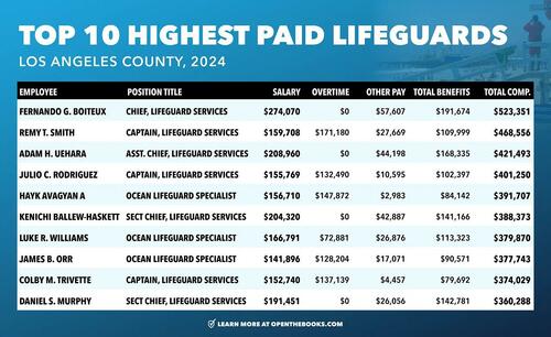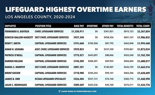 Lifeguards, too, enjoy big overtime payouts and generous benefits. The top-paid lifeguard in LA county was compensated more than $500,000 in 2024; and over the past 5 years, a single lifeguard was able to pull down $702,000 – in overtime alone!
