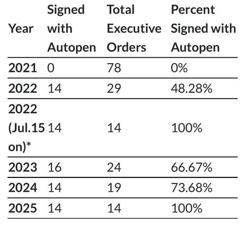 In 2023, two thirds of the orders were autopenned, and in 2024 that figure rose to three quarters, before again hitting 100 percent in the last days of his presidency in 2025.