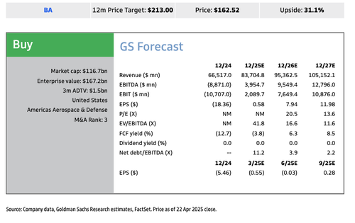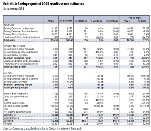 Details: Revenue of $19.50bn is in line with FactSet at $19.46bn, and up 18% yoy. Core EPS of $(0.49) compares to consensus at $(1.18) and our $(0.83), driven primarily by revenue and margin at BDS. The BCA segment operating income of $(537)mn compared to our estimated $(406)mn. BDS margin of 2.5% is above our (4.0)% estimate. The BGS margin of 18.6% is 80bps above our estimate and up 40bps yoy. 1Q25 free cash flow is $(2.3)bn, ahead of us and consensus at $(3.7)bn. The company still expects to reach a rate of 38/month on 737 and 7/month on 787 this year.