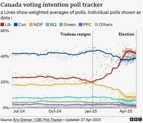 Then, after US President Donal Trump began threatening - and imposed, 25% tariffs on many goods from Canada, Carney's fortunes shifted and he called an early election.