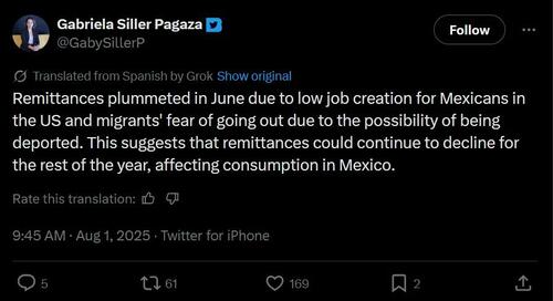 "Remittances plummeted in June due to low job creation for Mexicans in the United States and the fear of migrants to go out due to the possibility of being deported," Gabriela Siller, director of economic analysis at Banco Base, wrote on X on Friday, adding that "remittances could continue to decline for the rest of the year, affecting consumption in Mexico."