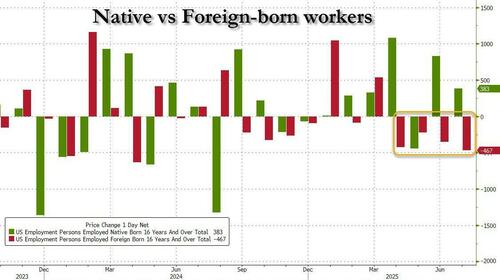 As we noted on Friday, there has been an unprecedented purge of illegal alien workers in the United States. In July, the number of foreign born workers tumbled by 467K. It wasn't just July though: as shown below, foreign-born workers (which, again, are mostly illegal aliens) have declined four months in a row...