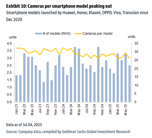 "For cameras, the number of cameras per phone peaked in 2022 at 3.8 cameras and was down to 3.3/ 3.1 cameras in 2024/ 2025 YTD; however, 20MPx+ penetration increased to 52%/ 51% in 2024/ 2025 YTD (vs. 39%/ 31% in 2023/22), in line with our view of camera specification upgrades for China smartphones," the team of analysts led by Allen Chang told clients over the weekend.