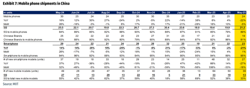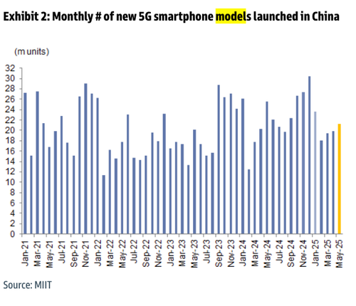 • The number of new 5G smartphone models launched in China was -52% YoY to 13 models in May 2025 vs. -14% YoY to 19 models in Apr 2025, per MIIT.