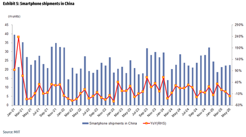 The latest data from Goldman Sachs shows smartphone shipments in China plunged 21% year-over-year in May to 23 million units. While shipments ticked up 1% month-over-month, they remain under pressure due to a high base effect from 2024, a particularly strong year in shipments. Cumulatively, shipments are down 5% year-to-date through May.