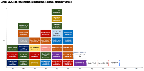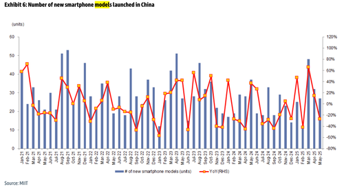 • The number of new smartphone models launched in China was -27% YoY to 27 models in May 2025 vs. +14% YoY to 32 models in Apr 2025, per MIIT.