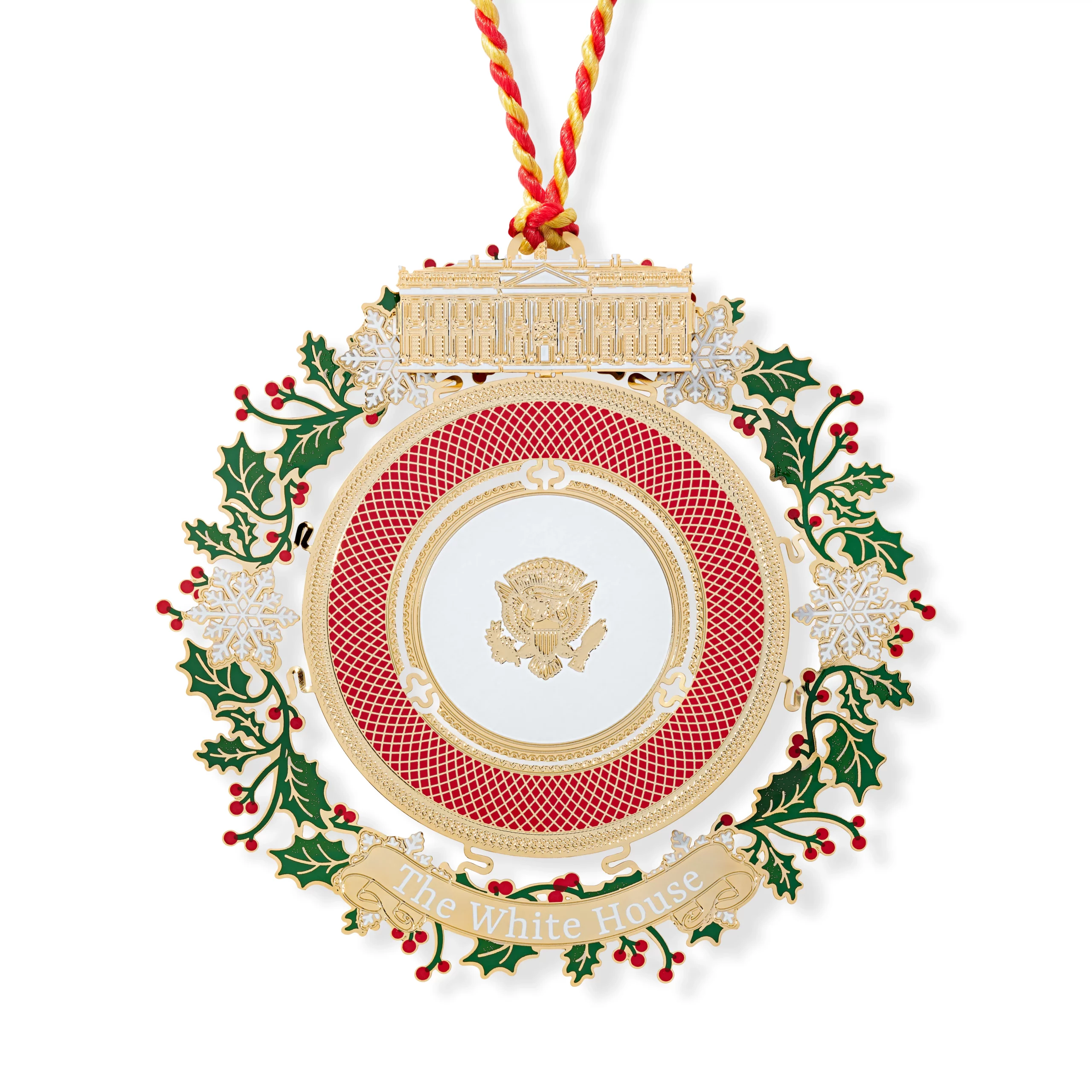“The Official 2025 White House Christmas Ornament is made of brass and finished with 24-karat gold, featuring the design of the red Reagan State China Service and the gold-rimmed Clinton State China Service, that was created to celebrate the two-hundredth anniversary of the White House,” said the association.