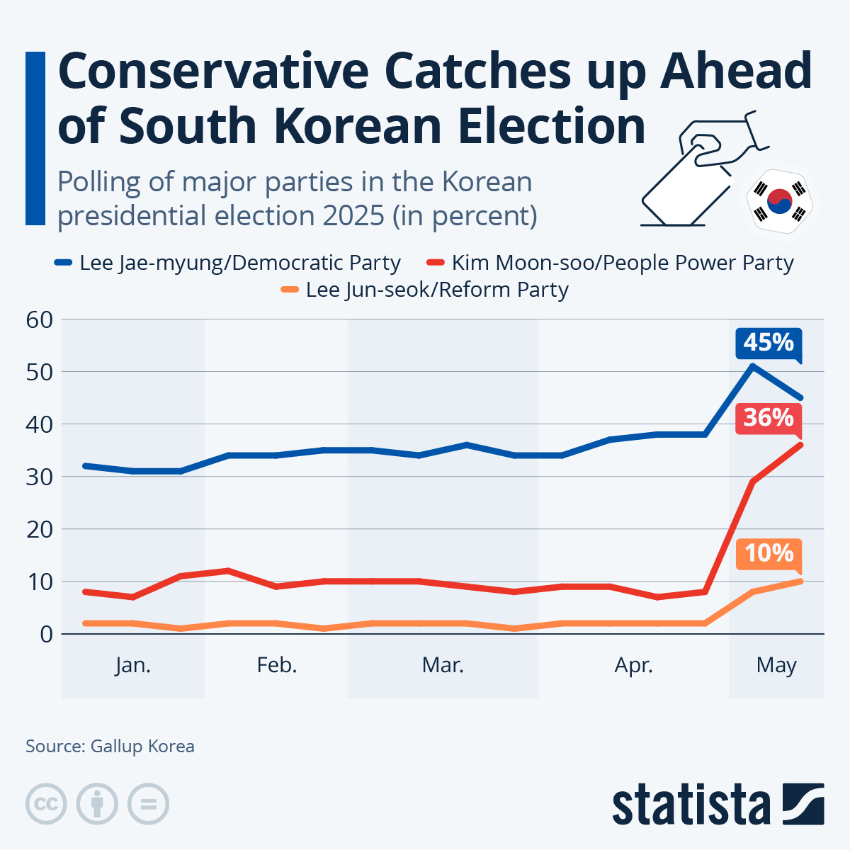 However, as Statista's Katharina Buchholz shows in the chart below, in the last weeks leading up to the election next Tuesday, the conservative candidate has caught up again, as seen in polling by Gallup Korea.