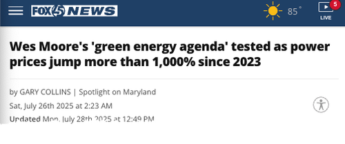 Power bills are spiraling out of control in counties just north of Washington, DC, because far-left Governor Wes Moore and crazed progressive lawmakers in Annapolis prioritized failed ‘green’ policies in the age of increasing baseload power demand from data centers, EVs, and other electrification trends.