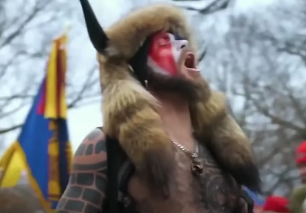 Jacob Chansley has just been released early from his 4 ½ year sentence a few weeks after Tucker Carlson released new footage from the Capitol on Jan. 6 that shows Chansley peacefully walking around the Capitol with police officers and leading a prayer in the House chamber thanking the police for their help. According to the Democrat Newsmedia Colluders (hereafter the DNC), Chansley is the “QAnon Shaman” that ‘led’ an armed insurrection against the United States on Jan. 6, 2021, and of whom MSNBC said, “Make no mistake… Chansley is a stone-cold thug.”