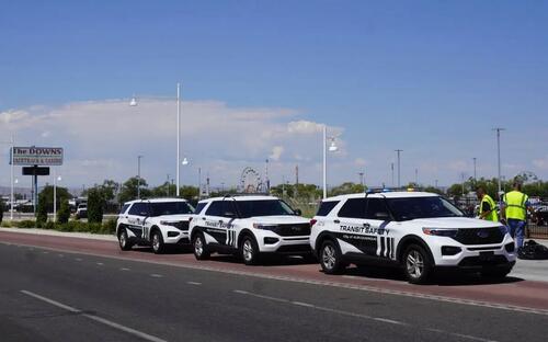 Transit Police vehicles line Central Avenue within the International District in Albuquerque, N.M., on Sept. 3, 2025. Allan Stein/The Epoch Times