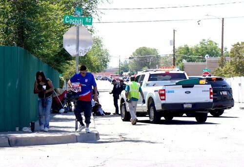 In the shade of a tall fence along Central Avenue, a group of homeless people lingered in Albuquerque’s troubled International District as three squad cars and a medical vehicle swept onto the scene.