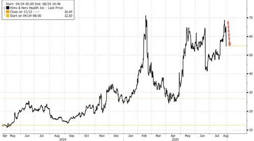 Shares of HIMS are down about 13% in premarket trading as of 6:45 a.m. ET, falling from Monday’s close near record highs of $63 to around $55 per share.