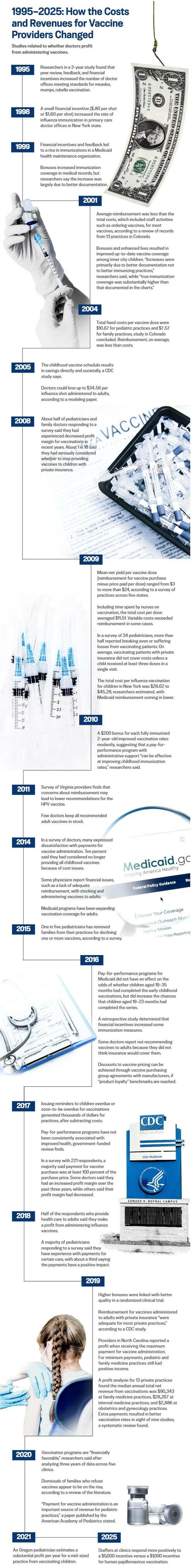 The organization declined to make one of its experts available for an interview on the topic. When a spokeswoman was sent studies, including multiple published by the AAP’s journal Pediatrics, that show some pediatricians have made money from vaccinating, she pointed to an AAP webpage that states “pediatricians recommend childhood vaccines because they are one of our most effective tools to help keep children healthy and prevent diseases from spreading in communities.”