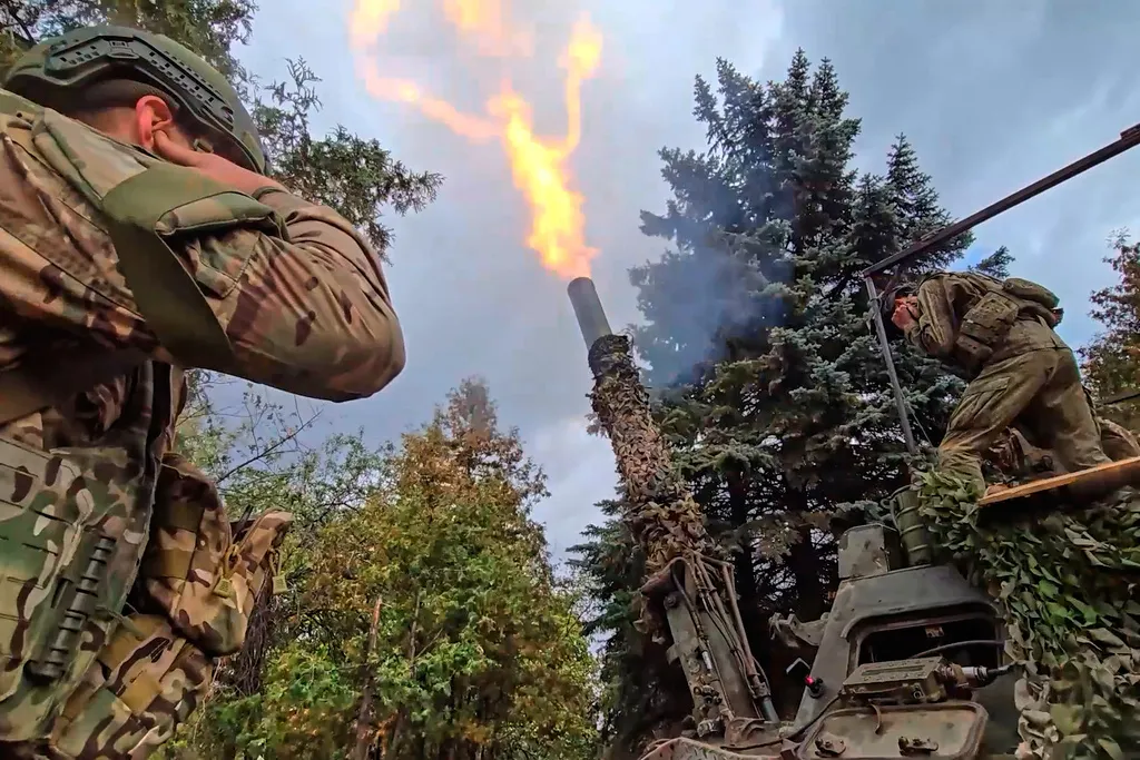 The Russian 240mm “Tyulpan” mortar fires toward Ukrainian positions on an undisclosed location in Ukraine on Thursday, Oct. 23, 2025. (Russian Defense Ministry Press Service via AP)