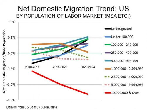 The new data through 2024 reflects a profound reversal of this earlier trend, a shift from patterns that have existed for at least a century. Each of the population categories of 1,000,000 or more lost net domestic migration after 2015, while all of the smaller population categories gained net domestic migration.