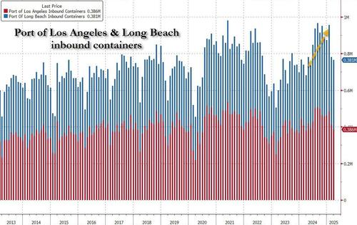 First, regarding the claim that west coast ports have seen a sharp drop in inbound traffic, there certainly has been a modest decline in February and March inbound traffic, but a decline from a near-record print in January, which in turn was the result of inventory restocking ahead of what most retailers knew would be a trade war. After all, Trump had made it clear about a year ago that he had every intention of restarting trade war with the world, and especially China, and only someone watching CNN would be surprised by the recent sharp spike in tariffs, a move which incidentally was never meant to be permanent but was a strategy meant to inflict max pain and get trading partners to the negotiating table. In any case, the total inbound traffic to California ports shown below is hardly the apocalypse the liberal media has been making it out to be (and even Reuters discusses this in “Near-record US container import streak expected to snap in May due to tariffs“).