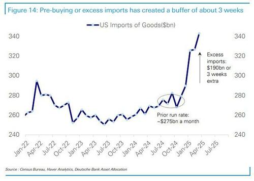 Then, addressing the topic of imminent product shortages, this was another fake news narrative meant to spark panic and chaos, and resulting in just the outcome the media was "warning" about. Because if it hurts Trump, it's great for MSNBC and CNN... and of course China, which begs the question: just how much "ad dollars" and/or sponsorship have these media outlets received from Beijing and Chinese companies in recent months. As the following charts from Deutsche Bank demonstrate clearly, what has been taking place in recent months - and why we are now seeing the reverse - is record prebuying and excess imports...