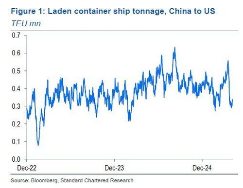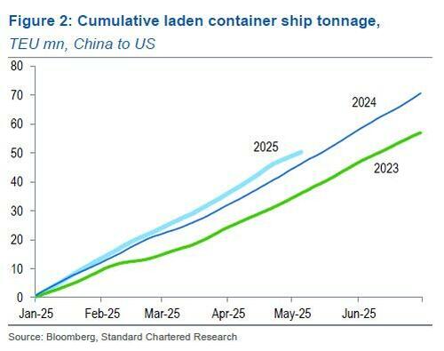 Going back to the media’s favorite topic of dropping cargoes from China, it wasn’t just us that countered the popular narrative: so did Standard Chartered’s Steve Englander who wrote last week that “the lurid headlines on the drop in cargoes from China may be misleading.” That’s because as we noted above, the volume of laden cargo now being shipped from China to the US is down almost 50% versus mid-April 2025, but the mid-April level was very high, and while you will never hear this on CNN, the current level is about on a par with much of 2023. In fact, Englander said that “the current pace as the low end of normal over the last couple of years.” Again, hardly the apocalypse Kevin Plank’s favorite media body (we use the term loosely) portrays it to be.