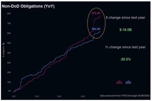Another measure of DOGE’s early success is the 20.5% reduction in non-defense federal obligations compared to 2024 levels—a decline that signals reduced future cash outlays as these obligations come due.