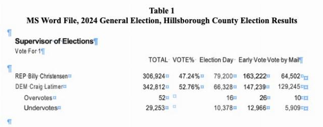 At Christensen’s advice, we took the 2024 Florida general election results, reported in PDF format by the Hillsborough County SOE’s office, and converted the report into a Microsoft Word file. While the alteration of the data was not apparent in the official PDF report, the anomalies emerged in the underlying MS Word file from which the PDF version was generated.