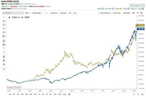 Consider that gold has now outperformed the US stock market (dividends included) over the last 25 years. And yet, very few institutions and almost no retail investors own it.