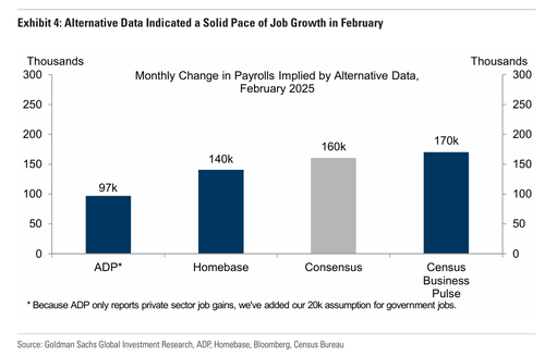 US employers likely added 160,000 jobs last month, showcasing a labor market holding steady in the face of mounting policy uncertainty, according to economists surveyed by Bloomberg, although as UBS notes, the whisper number is well lower, at around 122,000 (our full preview can be found here).