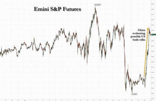 Futures spiked, moving back to session highs and forgetting all about the bitter taste from disappointing results from Amazon and Apple, following news from Bloomberg that China was “assessing the possibility of trade talks with the US” the first sign since Donald Trump hiked tariffs last month that negotiations could begin between the two sides.