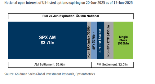 While markets remains focused on geopolitics, the big event for markets today is today's $5.9 trillion option expiration, including $4.0 trillion of SPX options and $925 billion notional of single stock options. This options expiration will be the largest June expiration on record...