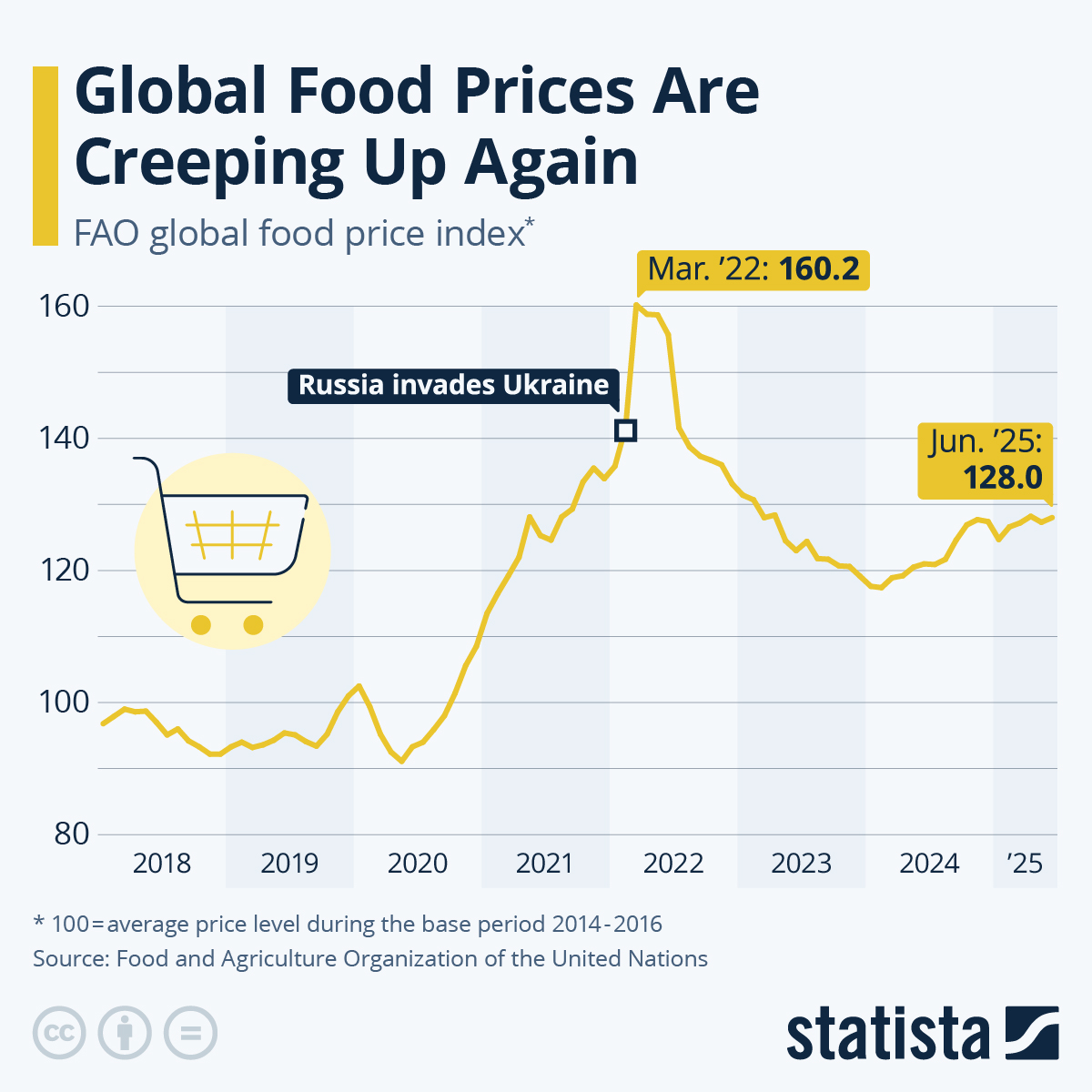 According to the Food and Agriculture Organization of the United Nations (FAO), the FAO Food Price Index climbed to 128 points in June 2025, indicating a 28-percent increase in global food prices compared to the 2014-2016 base period.