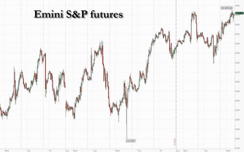 Turning back to earnings, where we see the first mega tech names report later today with GOOGL and TSLA, the “Magnificent Seven” are expected to post a combined 14% rise in second-quarter profits, while earnings for the rest of the US equity benchmark are predicted to be relatively flat, according to Bloomberg Intelligence data. Analysts will be studying the latest quarterly earnings from big tech for signs of resilience in a sector that has driven the rebound in US equities. Nasdaq 100 futures pointed to small gains at the open.