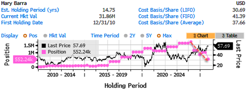 Bloomberg data shows that Barra's stock sales began in the summer of 2024 and have continued ever since, reducing her total position to 2018 levels. Barra became CEO in January 2014.