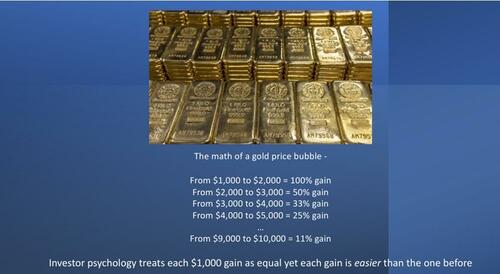What investors don’t realize at least initially is that each $1,000 per ounce gain is easier than the one before. This phenomena involves the interaction of simple math and more complicated behavioral psychology.