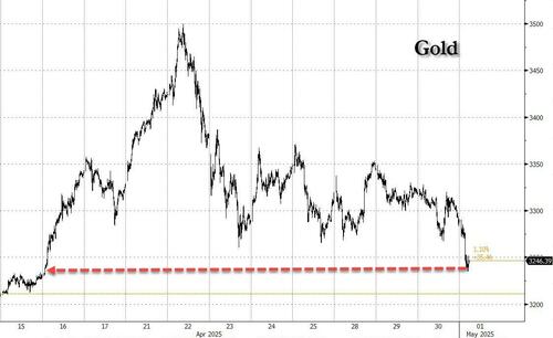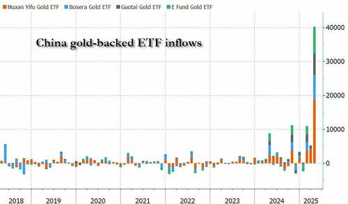 Just one week ago, China seemingly couldn’t get enough of gold, and the price of spot briefly touched a record $3500 as a result of, among other things, staggering inflows into Chinese gold ETFs such as the Huaan Yifu, Bosera and Guotai gold ETFs.