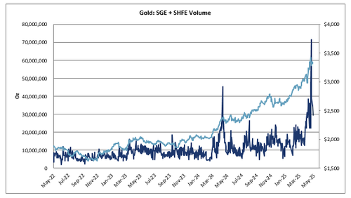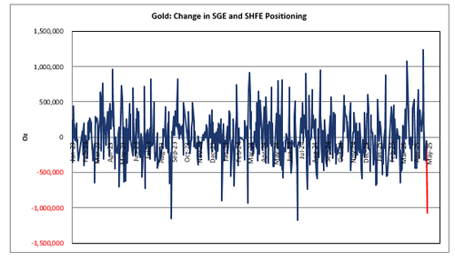 ... so fast forward to today, when China liquidated a near-record 1mn oz across SHFE and SGE, reversing the entire April 22 blow-off top.