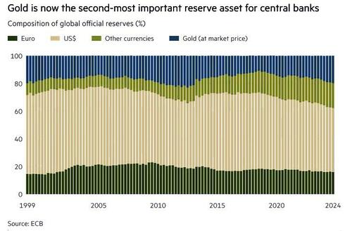 As shown in the chart below, gold accounted for 20% of global official reserves last year, surpassing for the first time the euro’s 16%, and second only to the US dollar at 46%, data from an ECB report published on Wednesday showed.