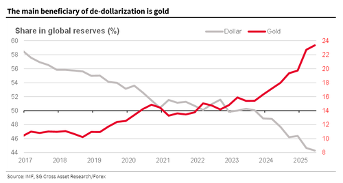 But what is perhaps far more notable is that as Socgen shows, since 2024, dedollarization has not benefited any of the major reserve currencies as one would expect in a fiat world where one currency’s loss is another currency’s gain. Instead, the share of gold in the IMF’s classification has increased.