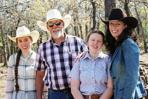 The Traywick family, (L–R) Hannah, Walt, Elaine, and Saundra, pose on their donkey dairy farm in Luther, Okla., on April 9, 2025. The Traywicks, whose daughter Hannah has an autoimmune disorder, are pushing to ban biosolids in the state over health concerns posed by chemicals in the material. Michael Clements/The Epoch Times