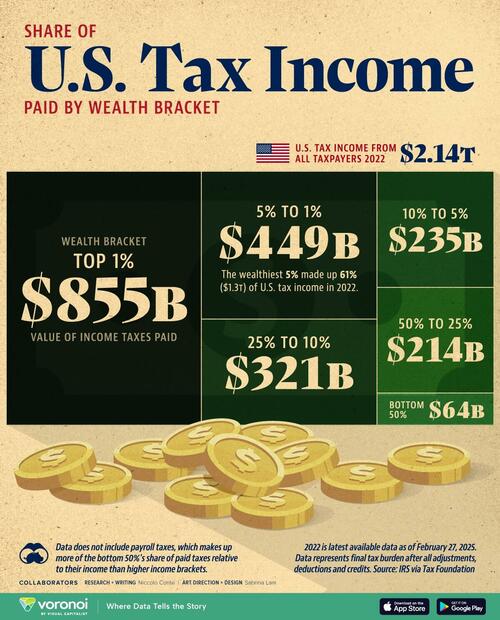 This graphic, via Visual Capitalist's Dorothy Neufeld, shows federal income tax revenue by wealth bracket, based on analysis of IRS data from the Tax Foundation.