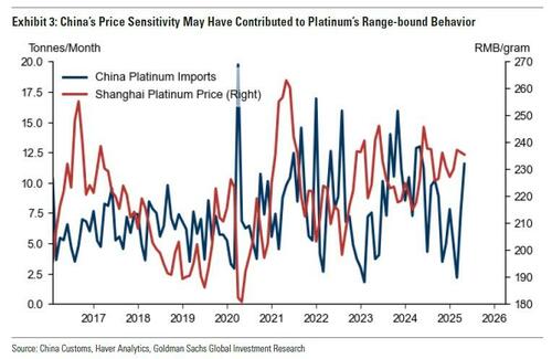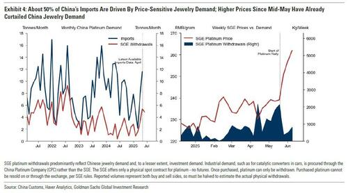 Goldman believes that this strategic buying has likely contributed to platinum’s range-bound trading over the past decade. Nearly 50% of China’s imports are driven by price-sensitive jewelry and investment demand. For instance, lower prices post-the ‘Liberation Day’ US tariff announcement contributed to higher platinum withdrawals from the Shanghai Gold Exchange (SGE), a proxy for Chinese jewelry and, to a lesser extent, investment demand, in April and consequently high Chinese platinum imports that month. But – the bank argues – the rally that started in mid-May appears to have already curtailed Chinese jewelry (and investment) demand for platinum. Which however is irrelevant if speculators have enough firepower to keep pushing the ascent higher, in which case Chinese jewelers will eventually be forced to chase the price again, only this time much higher.