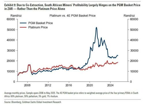 Here Goldman admits that PGM production cannot be easily increased due to capacity constraints, which is bullish for the price; alternatively, significant curtailments are also rare due to a high proportion of fixed costs inherent in these operations, particularly energy and labor. The heavily unionized nature of South Africa’s mining sector makes layoffs "politically sensitive" and doing so could increase the risk of strikes, social unrest and reputational damage. These socialist factors support a strategy in which mines operate at a high capacity utilization without materially increasing output; in other words just churning. Lower capex guidance - similar to the US shale patch - suggests producers are focused on extracting more from existing assets