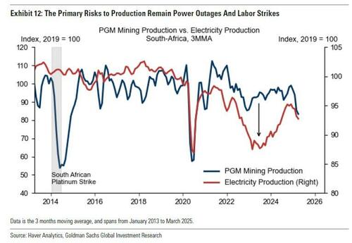Goldman’s optimistic view notwithstanding, the main risk to production remains operational disruptions and thus South African power outages and labor strikes represent the most significant threats to supply. Such events can halt production entirely and lead to substantial, albeit often temporary, supply deficits.