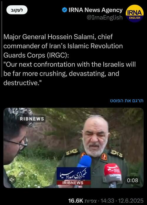 Update2215ET: In a massive development via Iranian state sources, the head of the Islamic Revolutionary Guard Corps (IRGC), Major Gen. Hossein Salami has been killed in Israel's major Israeli attack on Tehran and other locations in Iran. Al Jazeera: "Iran’s Tasnim news agency and Tehran Times newspaper say Hossein Salami, commander-in-chief of the Islamic Revolutionary Guard Corps, has been killed in an Israeli strike."