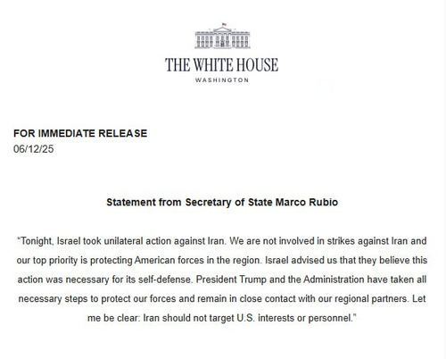 - *RUBIO: ISRAEL TOOK UNILATERAL ACTION VS IRAN