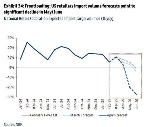 Two charts stood out, including this one, citing data from the US National Retail Federation showing expected import cargo volumes to plunge over the next two months.